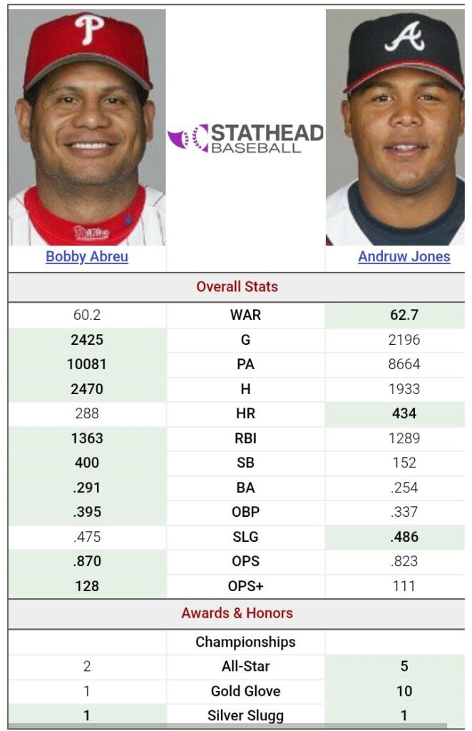 Las estadísticas generales reflejan carreras extensas y productivas, con Abreu acumulando 60.2 de WAR y Jones alcanzando 62.7, cifras muy similares en valor total.