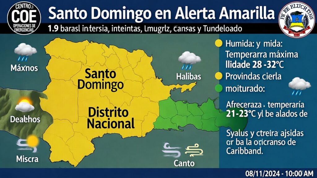 Entre las provincias en alerta amarilla figuran La Altagracia, La Romana, San Pedro de Macorís, Monte Plata, Hato Mayor, El Seibo, Duarte, Samaná, María Trinidad Sánchez y Monseñor Nouel.
