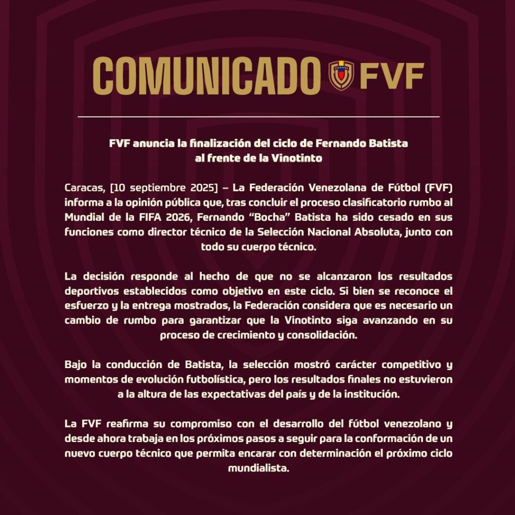 La Federación Venezolana de Fútbol anunció oficialmente su desvinculación tras el fracaso en las eliminatorias, confirmando que el proyecto Batista nunca logró despegar ni generar confianza.