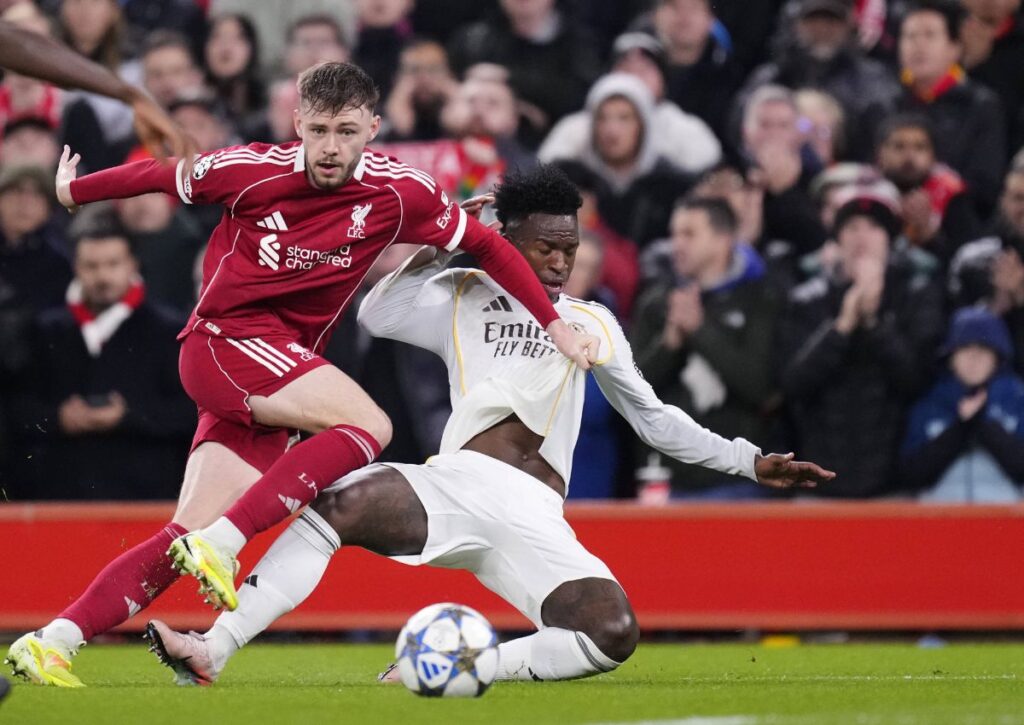 Vinicius Jr. y Bellingham fueron contenidos por la defensa inglesa. El joven Dean Huijsen recibió amarilla tras una entrada fuerte sobre Darwin Núñez.
